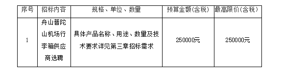 根据《中华人民共和国招标投标法》等有关规定,浙江荣昕项目管理有限公司受舟山普陀山机场有限公司委托,就舟山普陀山机场行李箱供应商选聘项目(重新招标)进行公开招标,欢迎有能力的单位前来投标。